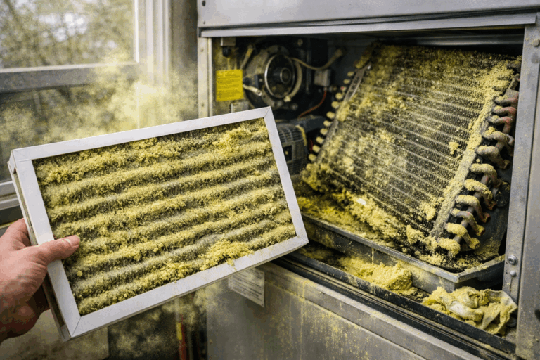 This isn’t a problem you’ll see coming. By the time your system shows obvious symptoms — weaker airflow, longer run times, rooms that won’t cool evenly — the damage from a season of pollen neglect is already done. Here’s what’s actually happening inside your system right now, and what to do about it before you need your AC for real.